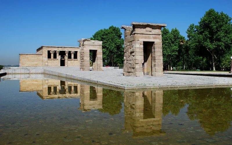 The temple itself is over 2,000 years old, gifted to Spain by Egypt and rebuilt stone by stone. Today it sits above Parque del Oeste, with sweeping views over Casa de Campo, the Royal Palace, and the distant mountains. As sunset approaches, the pools surrounding the temple turn into mirrors, doubling the colors in the sky.