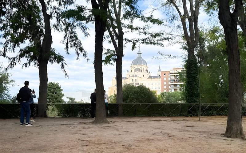The viewpoint sits along a long pedestrian stretch that begins at Plaza de España, lined with striking architecture including the Royal Palace, the Teatro Real, and the Sabatini Gardens. From here, you can easily spot both the Royal Palace and Almudena Cathedral.